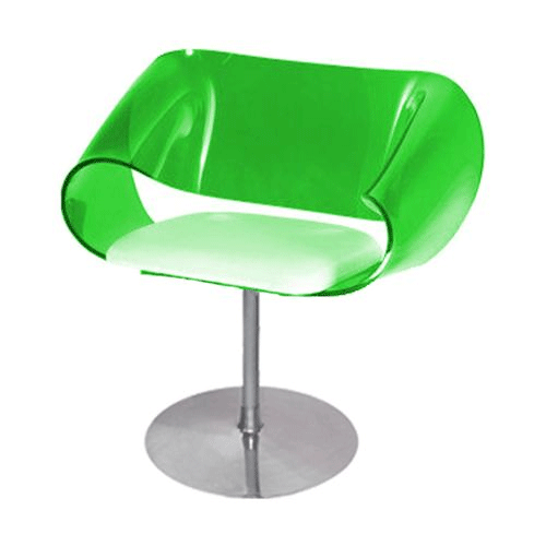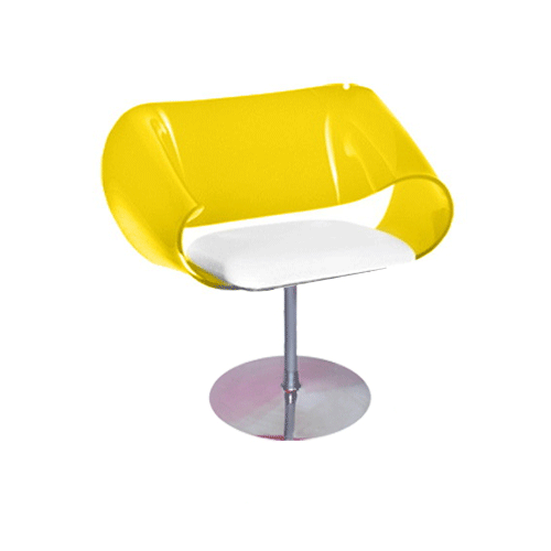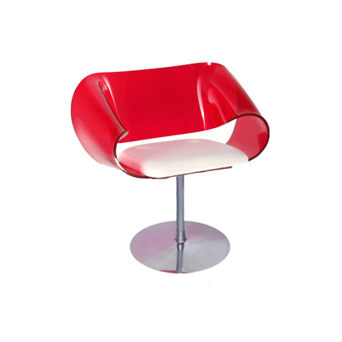Concha em acrílico 10 mm em várias cores, assento com revestimento em tecido, couro ecológico ou natural, base em aluminio fundido e polido.